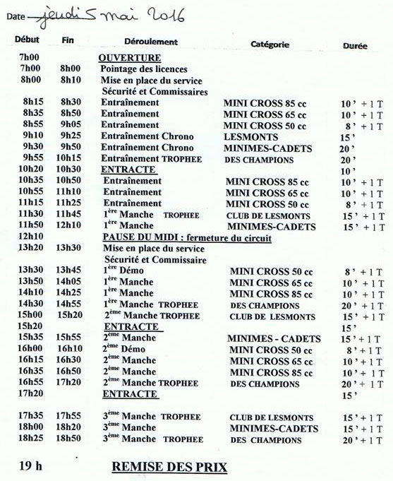 Les horaires prévisionnels et les engagés des deux Trophées du motocross de Plouer/Rance ce jeudi 5 mai 2016.